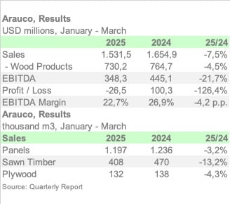 As a result, Arauco reported a net loss of USD 26.5 million, a sharp turnaround from the USD 100.3 million profit recorded in 1Q-2024 — representing a 126.4% drop in net income.
