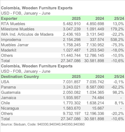 COLOMBIA – Colombia’s wooden furniture exports totaled USD 27.3 million between January and June 2025 (6M-2025), marking a 10.6% decline compared to the same period in 2024, according to customs data.