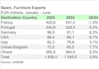 France remains the leading destination, accounting for 26.5% of total exports, despite a slight decline of 1.3%. Other major markets posted stronger results, with the United States ranking fourth and increasing its purchases of Spanish furniture by 8.1%.
