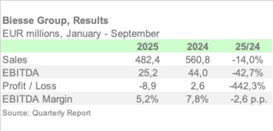 At the end of the third quarter, Biesse’s order backlog stood at EUR 210.9 million, down 17.4% from December 2024 (EUR 255.2 million). Order intake decreased 11.9% year-over-year, reflecting lower turnover during the period.