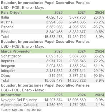 ECUADOR – Las importaciones ecuatorianas de papel decorativo para paneles de madera alcanzaron los USD 15,56 millones durante los primeros cinco meses de 2025 (5M-2025), lo que representa un aumento del 8,9% interanual, según datos de aduana.