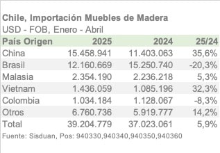 Los datos confirman el dinamismo de la oferta china y la sostenida demanda del mercado chileno por muebles importados en un entorno competitivo y cambiante.