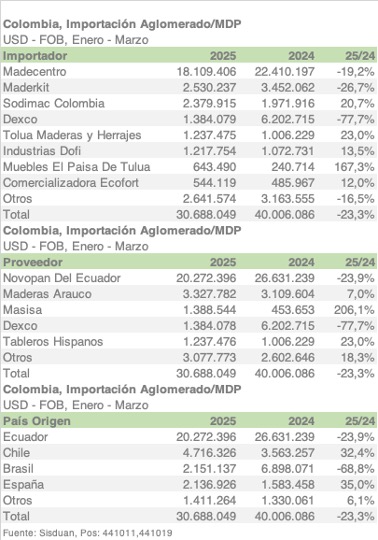 Importaciones colombianas de aglomerado caen 23,3% en 1T-2025