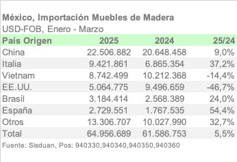 MÉXICO – Durante el primer trimestre de 2025, México importó muebles de madera por un total de USD 64.9 millones, lo que representa un incremento de 5,5% respecto al mismo periodo de 2024.