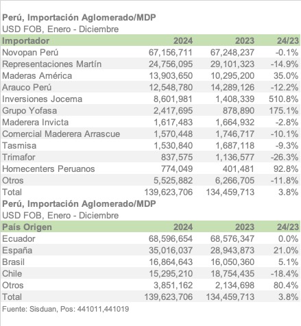 Novopan Perú mantuvo su posición como el principal importador, con importaciones por USD 67,16 millones en 2024, una disminución ligera del 0,1% con respecto al año anterior. Representaciones Martín, el segundo mayor importador, experimentó una caída del 14,9%, con importaciones que pasaron de USD 29,10 millones a USD 24,76 millones.